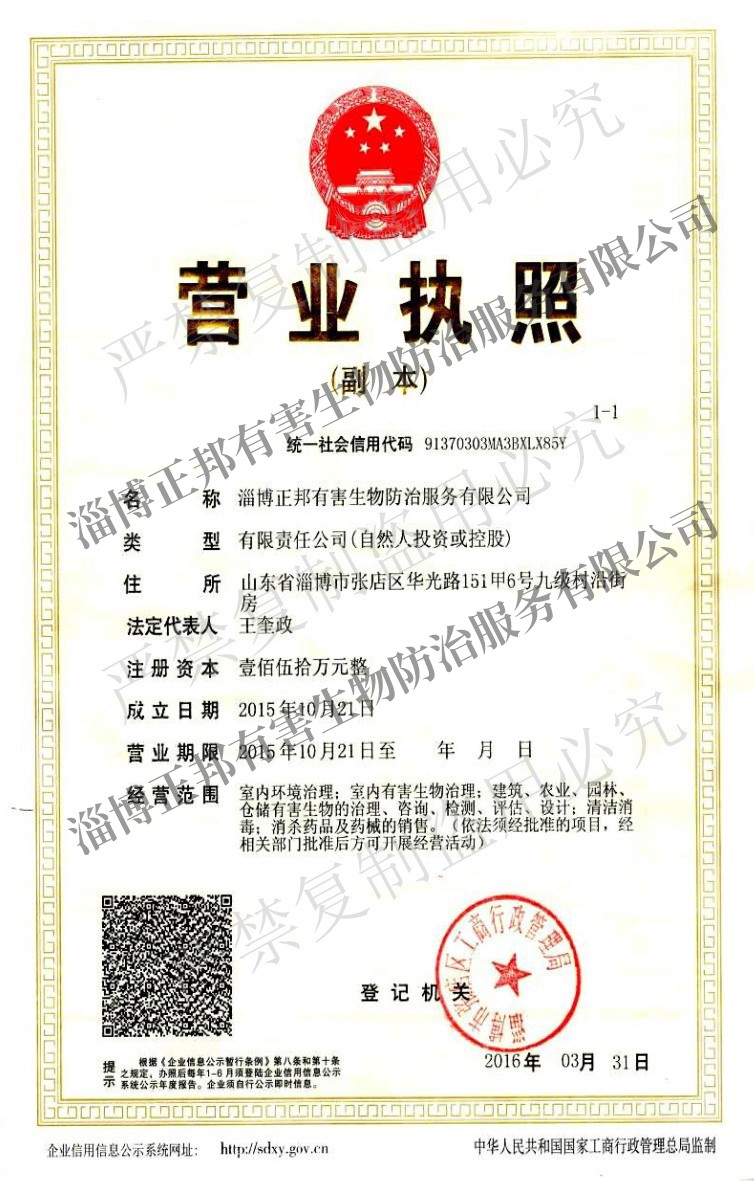 您好,歡迎訪問正邦有害生物防治服務有限公司,是知名的淄博殺蟲公司,淄博滅老鼠公司,淄博滅蟑螂公司~
